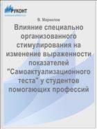 Маркелов ВЛИЯНИЕ СПЕЦИАЛЬНО ОРГАНИЗОВАННОГО СТИМУЛИРОВАНИЯ НА ИЗМЕНЕНИЕ ВЫРАЖЕННОСТИ ПОКАЗАТЕЛЕЙ «САМОАКТУАЛИЗАЦИОННОГО ТЕСТА» У СТУДЕНТОВ ПОМОГАЮЩИХ ПРОФЕССИЙ В статье анализируется структура профессионально-творческой самоактуализации (ПТС) студентов. <...> По результатам выполнения респондентами (N=126) «Самоактуализационного теста» (САТ) до и после эксперимента обнаружена эффективность лекционно-практической формы подачи стимулирующего материала; выявлены изменения в двух жизненных сферах личности — ценностной и самопринятии; между студентами очной и заочной форм обучения отмечены различия в независимости поведения и поступков от воздействия извне, в стремлении руководствоваться в жизни собственными целями, убеждениями, установками и принципами. <...> Ключевые слова: самоактуализация, развитие личности, помогающие профессии, стимулирование, «Самоактуализационный тест» (САТ), студенты очной и заочной форм обучения. <...> Маркелов Владимир Иванович — аспирант кафедры психологии и социальной работы ф-та права и социальных коммуникаций Российского гос. ун-та туризма и сервиса (Москва). <...> E-mail: admin@rgutis.net Работа выполнена под руководством канд. психол. наук В.А. Каращан. <...> 148 Теоретический контекст исследования Для психологов, педагогов, воспитателей, врачей, социальных работников и для других специалистов, чья трудовая деятельность непосредственно связана с оказанием помощи людям, высокую значимость имеют такие характеристики, как способность взять на себя ответственность, креативность, рефлексивность, умение работать в коллективе, готовность к дальнейшему саморазвитию и самосовершенствованию (Маркелов, Каращан, 2011). <...> Эти качества наиболее полно проявляются у личности, полностью раскрывшей свой внутренний потенциал, — самоактуализирующейся личности. <...> По мнению ученых (Маслоу, 2011; Роджерс, 1994; Селевко, 1998; Цукерман, 1997, 2010 и др.), процесс самоактуализации может протекать спонтанно, однако существует <...>